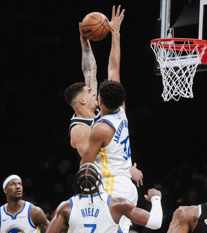 第二节上来库里的两次罚球命中,让勇士队32-31实现反超。此后两队在场上陷入僵持,双方你来我往,比分交替领先。半场比赛结束时,勇士队59-57领先篮网2分。